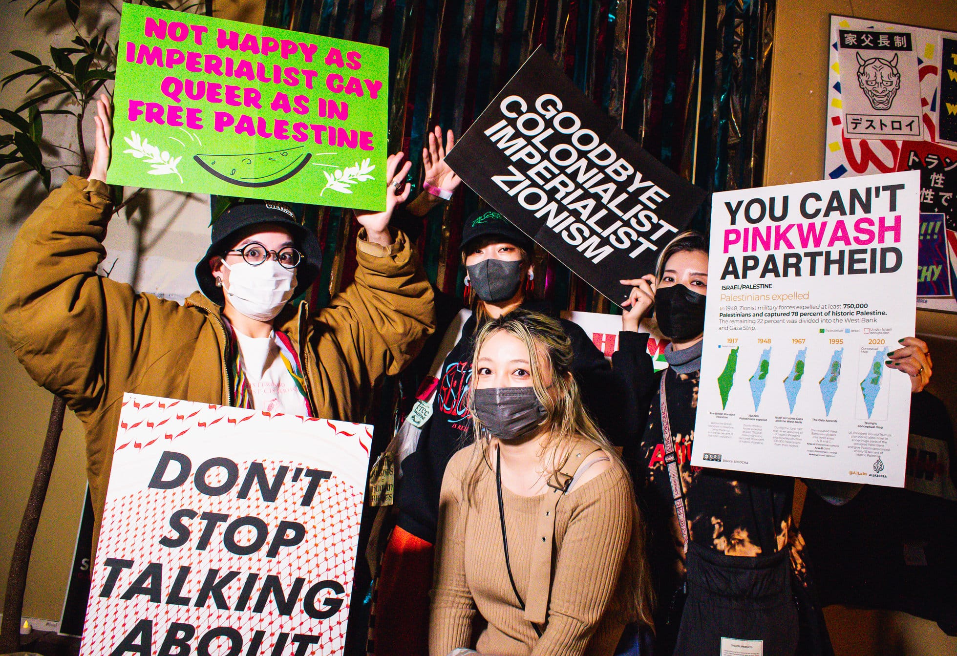 At the time there were no spaces or events centered around queer and trans people in Tokyo (as opposed to cisgender gay people), so WAIFU became a key space for the community. From the beginning, WAIFU had a political stance, partly because it originated as a counteraction to a situation of exclusion, and a culture of openness, safety and antidiscrimination has carried forward. The collective has been active in working toward accessible club spaces, antiracist actions including advocating for immigrants and refugees in Japan, and organizing to end the genocide in Palestine. WAIFU represents a space of resistance, but not because it is a rave. It is a space of resistance because it started as a political act and has remained engaged in political projects for the six years we have been organizing parties.
